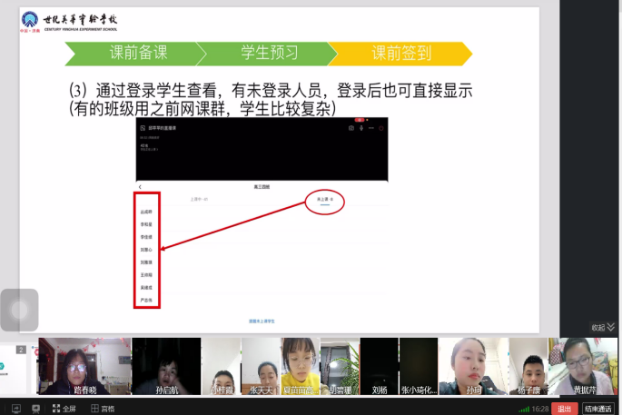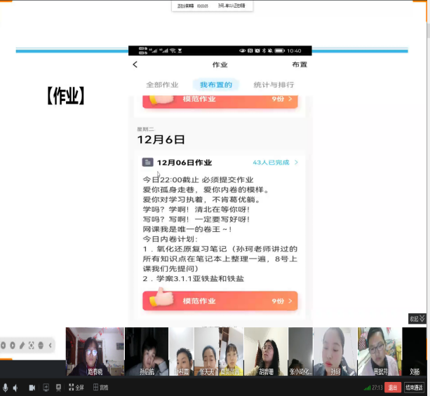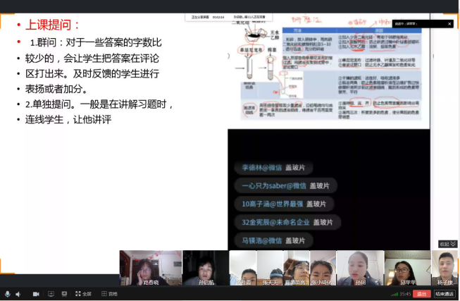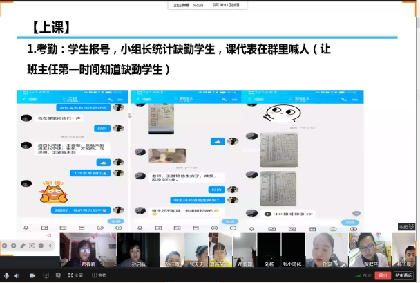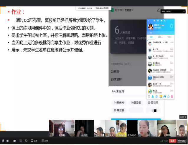 课前十分钟就要把上课的链接发到班级群里,提前进行点名签到,到点正式上课,不要耽误太长时间。上课过程中关注迟到的学生,确定没有上课的及时跟学生沟通并通知班主任,确保100%的出勤率。高一高二用的企业微信,关注没有上课的学生是否观看回放。作业可以利用QQ进行发布,利用提醒功能催交作业,每次作业的提交人数要达到95%以上。可以利用各班生本小组考核表进行统计。